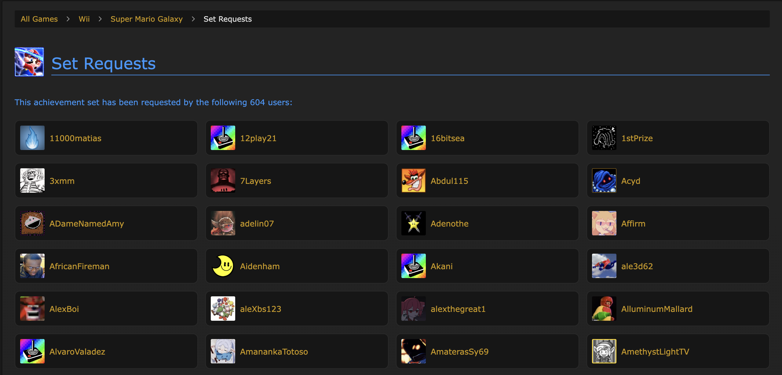 Note: All achievement developers are volunteers. Requesting a set gives no guarantee that achievements will be made. The purpose of the request feature is to give developers visibility to what players want most. You might also consider making achievement suggestions on a game's forum page to help get a set off the ground.